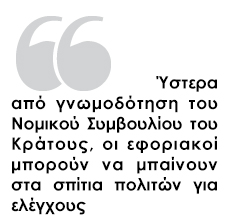 Τέλος, αυτό που θα πρέπει να γνωρίζουν οι πολίτες είναι ότι ο Άρειος Πάγος θα αποφασίσει-μέσα στις επόμενες εβδομάδες- εάν οι έλεγχοι σε σπίτια ή επιχειρήσεις θα πρέπει να γίνονται με τη συνοδεία εκπροσώπου της δικαιοσύνης.