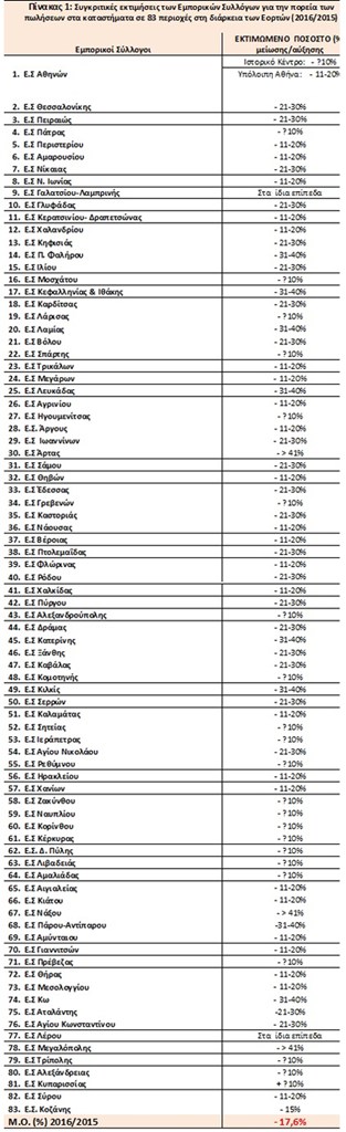Αναλυτικός πίνακας με τις εκτιμήσεις των εμπορικών συλλόγων αναφορικά με τη μεταβολή των πωλήσεων στα καταστήματα, σε 83 περιοχές της χώρας.