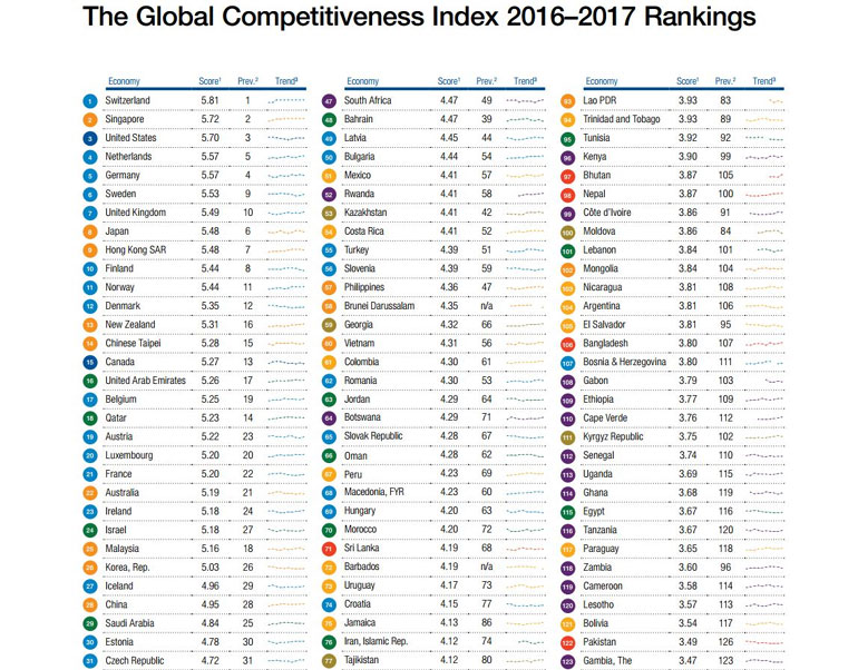 Στον Δείκτη Παγκόσμιας Ανταγωνιστικότητας 2016 – 2017 του World Economic Forum, την 3η θέση καταλαμβάνουν οι ΗΠΑ (με βαθμολογία 5,70), ενώ από την 4η μέχρι και την 7η θέση βρίσκονται ευρωπαϊκές χώρες: η Ολλανδία (5,57), η Γερμανία (5,57), η Σουηδία (5,53) και η Μεγάλη Βρετανία (5,49). Ιαπωνία (5,48) και Χονγκ Κονγκ (με βαθμολογία 5,48) ακολουθούν, ενώ η Φινλανδία (5,44) συμπληρώνει τη δεκάδα των πρωταθλητών κόσμου στην ανταγωνιστικότητα.