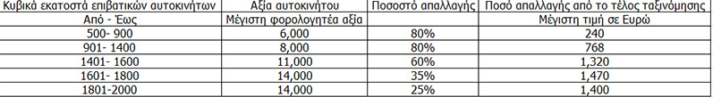 – Προβλέπεται απαλλαγή από το τέλος ταξινόμησης των καινούργιων επιβατικών αυτοκινήτων Ι.Χ. μέχρι 2.000 κυβικά εκατοστά, φορολογητέας αξίας μέχρι 20.000 ευρώ, εφόσον παραλαμβάνονται σε αντικατάσταση παλαιών αυτοκινήτων των οποίων η άδεια έχει εκδοθεί μέχρι τις 31.12.2001.
