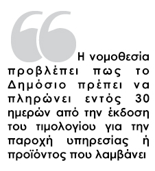 Σύμφωνα πάντως με τη νομοθεσία, η οποία θεσπίστηκε το 2013 βάσει ευρωπαϊκής οδηγίας, το ελληνικό Δημόσιο θα πρέπει να αποπληρώνει τις οφειλές του εντός 30 ημερών από την έκδοση του τιμολογίου για την παροχή υπηρεσίας ή προϊόντος που λαμβάνει. Παράλληλα, σε περίπτωση καθυστέρησης το Δημόσιο θα πρέπει να καταβάλει τόκο υπερημερίας, ο οποίος μέχρι τις 30 Ιουνίου 2014 ανερχόταν σε 8,25% (πρόσθετο επιτόκιο 8% + 0,25% επιτόκιο αναφοράς Ευρωπαϊκής Κεντρικής Τράπεζας, που ισχύει από την 1η Ιανουαρίου 2014). Όσον αφορά το δεύτερο εξάμηνο του 2014, ο τόκος υπερημερίας καθορίστηκε με βάση το επιτόκιο 8% και το επιτόκιο αναφοράς της Ευρωπαϊκής Κεντρικής Τράπεζας που ισχύει από την 1η Ιουλίου 2014.