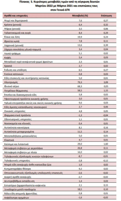 Είναι χαρακτηριστικό ότι μεταξύ Μαρτίου 2022 και Μαρτίου 2021 συνεχίστηκε η άνοδος του ενεργειακού κόστους (λόγω και του πολέμου), καθώς ανατιμήσεις σημειώθηκαν σε: Ηλεκτρισμό (79,3%), Φυσικό αέριο (68,3%) και Πετρέλαιο θέρμανσης (58,5%). Κατ’ επέκταση, υπήρξαν αυξήσεις τιμών σε: Καύσιμα και λιπαντικά (29%), Μεταφορά επιβατών με αεροπλάνο (26,8%) και Μεταφορά επιβατών με πλοίο (16%). Στο λεγόμενο «καλάθι της νοικοκυράς», οι τιμές αυξήθηκαν σε: Έλαια και λίπη (19,9%), Λαχανικά γενικά (13,6%), Γαλακτοκομικά και αυγά (8,4%), Φρούτα νωπά (7,8%), Ψωμί και δημητριακά (7,6%), Κρέατα γενικά (6,4%), Καφέ (5,4%), Λοιπά τρόφιμα (5,1%), Ψάρια γενικά (3,5%), Ζάχαρη – σοκολάτες – γλυκά – παγωτά (3,4%), Κρασιά (2,7%) και Μεταλλικό νερό – αναψυκτικά – χυμοί φρούτων (2,3%). Επίσης, συνεχίστηκαν οι ανατιμήσεις σε: Ξενοδοχεία – μοτέλ – πανδοχεία (18,5%), Αυτοκίνητα μεταχειρισμένα (11,5%), Υαλικά – επιτραπέζια σκεύη και σκεύη οικιακής χρήσης (9,6%), Αυτοκίνητα καινούργια (8,1%), Έπιπλα και διακοσμητικά είδη (5,8%), Ένδυση και υπόδηση (6,5%), Είδη επισκευής και συντήρησης κατοικίας (5%), Μοτοποδήλατα – μοτοσυκλέτες (5%), Οικιακές υπηρεσίες (4,8%), Ελαστικά (4,7%), Υφαντουργικά προϊόντα οικιακής χρήσης (3%), Είδη άμεσης κατανάλωσης νοικοκυριού (2,7%), Εστιατόρια – ζαχαροπλαστεία – καφενεία (2,1%), Οδοντιατρικές υπηρεσίες (1,1%), Δευτεροβάθμια Εκπαίδευση (1,4%), Ενοίκια κατοικιών (0,8%) και Νοσοκομεία και κλινικές (0,4%).