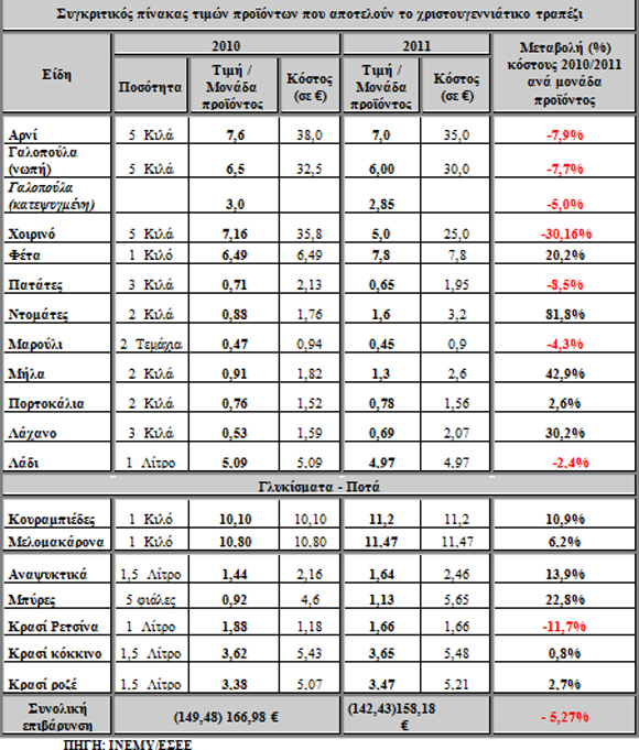 Πιο συγκεκριμένα, το χριστουγεννιάτικο τραπέζι για μια εξαμελή μέση ελληνική οικογένεια θα κοστίσει 158 ευρώ έναντι 167 ευρώ που κόστιζε πέρυσι την ίδια ακριβώς περίοδο, περιλαμβάνοντας τα ίδια ακριβώς προϊόντα. Η διαφορά αυτή των 9 ευρώ (που μεταφράζεται σε μείωση 5,27%) σε σχέση με τον Δεκέμβριο του 2010 οφείλεται κατά κύριο λόγο στη μείωση της τιμής των κρεατικών και ιδιαιτέρως του χοιρινού, η τιμή του οποίου κατά μέσο όρο εκτιμάται στα 5,0 ευρώ το κιλό και εμφανίζει μία μείωση 30,16% σε σχέση με πέρυσι, ενώ μείωση παρατηρείται και στην τιμή του αρνιού, η οποία κυμαίνεται περίπου σε 8%. Η γενική εικόνα που διαμορφώνεται αναφορικά με την τιμή των κρεάτων τη φετινή περίοδο σε σχέση με την αντίστοιχη του 2010, ισοδυναμεί με μία κατά μέσο όρο μείωση των τιμών κατά περίπου 12,7%.