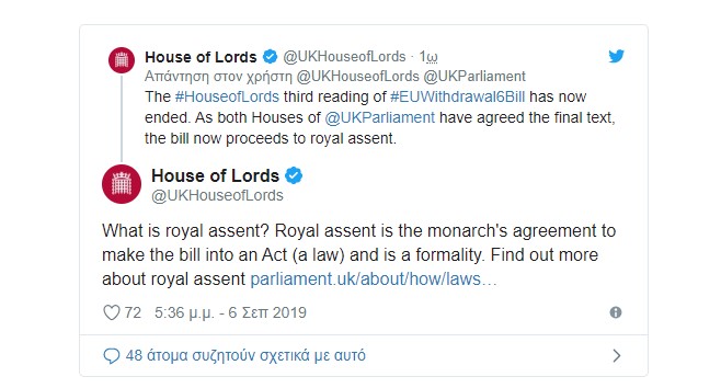 Στον επίσημο λογαριασμό της Βουλής των Λόρδων στο Twitter αναφέρεται ότι η υπογραφή της βασίλισσας «είναι τυπική».