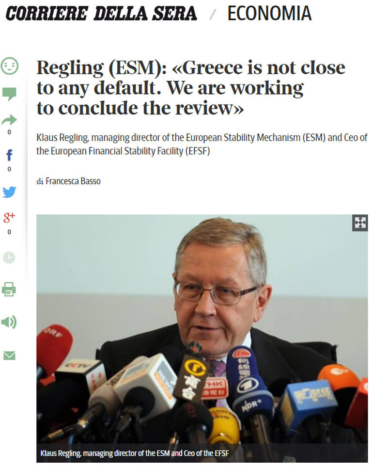 Σε συνέντευξή του στην ιταλική Corriere Della Sera, ο επικεφαλής του EFSF, Klaus Regling ερωτηθείς για τους κινδύνους που ενέχει η καθυστέρηση ολοκλήρωσης των διαπραγματεύσεων, απάντησε: «Υπάρχει πράγματι μία οχτάμηνη καθυστέρηση στην αξιολόγηση επειδή υπάρχουν σχετικά προβλήματα εφαρμογής των μεταρρυθμίσεων στην Ελλάδα. Το ΔΝΤ και η Ε.Ε. έχουν διαφορετικές προβλέψεις αλλά αυτό δεν ευθύνεται για αυτή τη μακρά καθυστέρηση. Μιλάμε για προβλέψεις των επόμενων δύο ετών. Είναι απόλυτα φυσιολογικό να διαφέρουν οι προβλέψεις των θεσμών. Για να αποτραπούν ενδεχόμενες αποκλίσεις στα δημοσιονομικά στοιχεία, ζητήθηκε από την Ελλάδα να ετοιμάσει και να νομοθετήσει μέτρα τα οποία θα εφαρμοστούν μόνο εάν πραγματοποιηθεί το πιο απαισιόδοξο σενάριο που προβλέπει το ΔΝΤ. Η Ελλάδα πιστεύει ότι οι πιο θετικές προβλέψεις είναι σωστές και ότι αυτά τα μέτρα δεν θα είναι αναγκαία. Αυτά τα μέτρα αποτελούν έναν συμβιβασμό για τις αποκλίνουσες εκτιμήσεις αλλά παρέχουν επίσης μία ασφάλεια έναντι σε απρόβλεπτα γεγονότα».