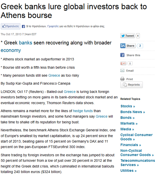 Ο Γενικός Δείκτης Τιμών του Χρηματιστηρίου της Αθήνας, σημειώνει το πρακτορείο, είναι αυξημένος κατά 24% από την αρχή του 2013, περισσότερο απ’ ό,τι ο δείκτης DAX του γερμανικού χρηματιστηρίου (15%) και ο πανευρωπαϊκός δείκτης μετοχών FTSEurofirst 300 (11%).