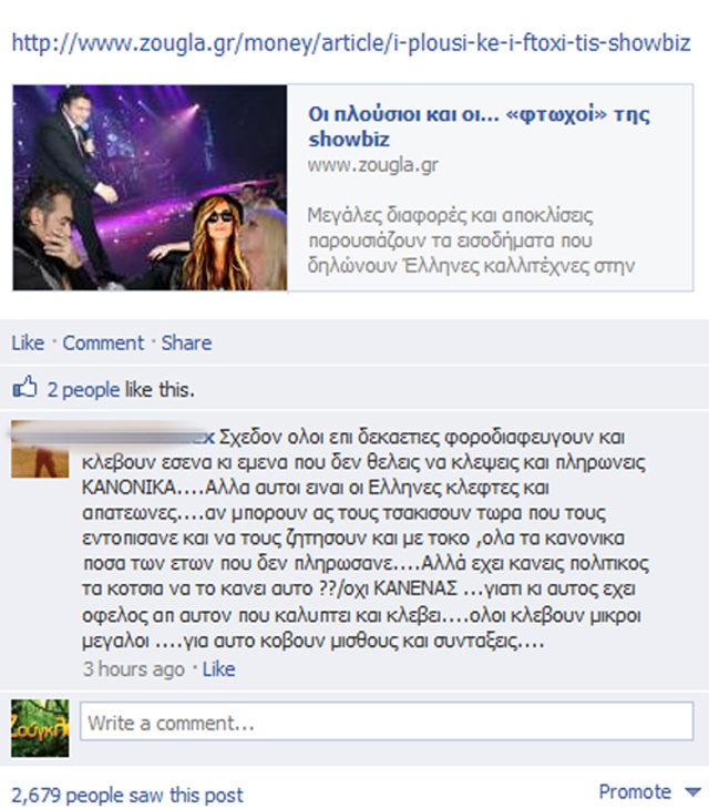 Σας παραθέτουμε ενδεικτικά σχόλιο που αναρτήθηκε στην επίσημη σελίδα της zougla.gr στο Facebook.