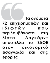 Τα ονόματα 72 επιχειρηματιών και ιδιωτών που περιλαμβάνονται στη λίστα Λαγκάρντ αποστέλλει το ΣΔΟΕ στον οικονομικό εισαγγελέα και στις εφορίες, με σκοπό την άμεση καταβολή δεκάδων εκατομμυρίων ευρώ.