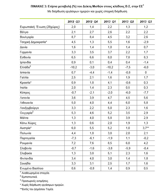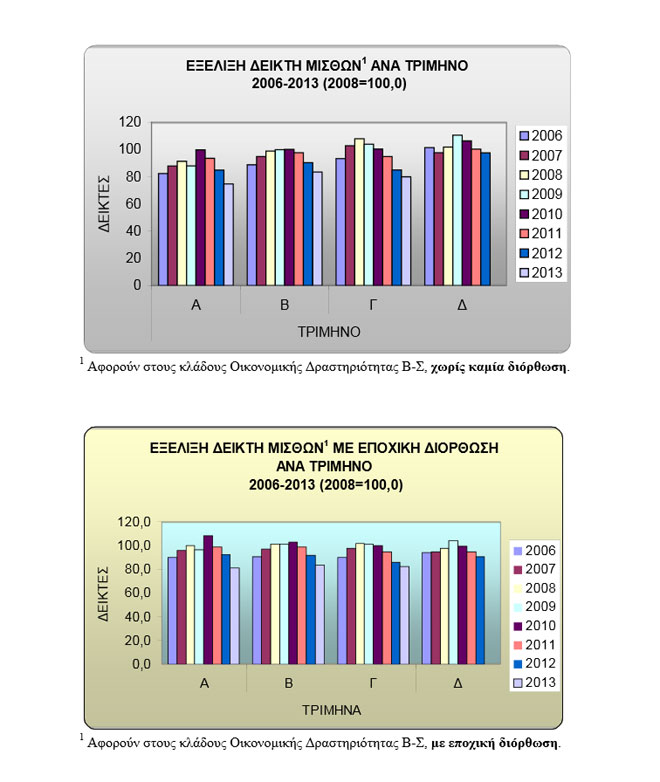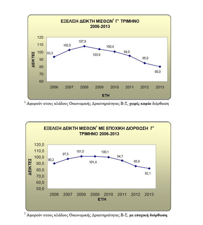Συγκεκριμένα, το γ΄ τρίμηνο του 2013 οι μισθοί στην Ελλάδα υποχώρησαν κατά 5,9% σε ετήσια βάση, έναντι μείωσης 10,3% που σημειώθηκε κατά την αντίστοιχη σύγκριση του έτους 2012 προς το 2011. Το β΄ τρίμηνο οι μισθοί υποχώρησαν κατά 7,5% και το α΄ τρίμηνο κατά 12%.