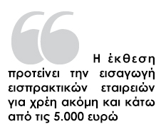 Στο πλαίσιο αυτό, η έκθεση προτείνει την εισαγωγή εισπρακτικών εταιρειών, για οφειλές ακόμη και κάτω από τις 5.000 ευρώ. Αναμφισβήτητα, όπως αναφέρουν παράγοντες της αγοράς, η υιοθέτηση ενός τέτοιου μέτρου, παρότι θα εξυπηρετούσε τις ανάγκες για είσπραξη των ληξιπρόθεσμων χρεών στα ασφαλιστικά ταμεία, θα είχε σημαντικό πολιτικό κόστος για την κυβέρνηση και θα προκαλούσε σημαντικές αντιδράσεις.