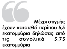 Σύμφωνα με τα στοιχεία του Υπουργείου Οικονομικών, μέχρι στιγμής έχουν κατατεθεί περίπου 5,5 εκατομμύρια δηλώσεις από τις συνολικά 5,75 εκατομμύρια.
