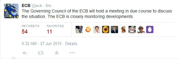 «Το Διοικητικό Συμβούλιο της ΕΚΤ θα πραγματοποιήσει συνεδρίαση εν ευθέτω χρόνω για να συζητήσει την κατάσταση. Η ΕΚΤ παρακολουθεί στενά τις εξελίξεις» αναφέρει η Ευρωπαϊκή Κεντρική Τράπεζα σε ανάρτησή της στο Twitter.
