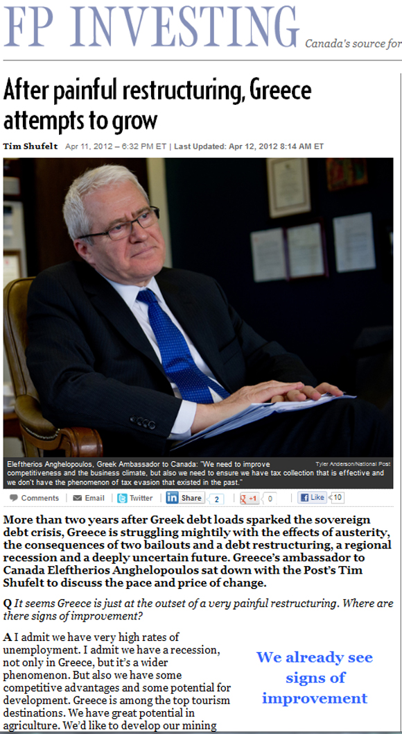 Με τίτλο, «Μετά από την οδυνηρή αναδιάρθρωση του χρέους η Ελλάδα προσπαθεί να αναπτυχθεί», η πανκαναδικής κυκλοφορίας έγκριτη εφημερίδα «National Post» δημοσίευσε εκτεταμένη συνέντευξη του Έλληνα πρέσβη στην Οττάβα Ελευθέριου Αγγελόπουλου.