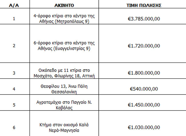 Ολοκληρώθηκε σήμερα η διενέργεια του ηλεκτρονικού διαγωνισμού για την αξιοποίηση 6 δημόσιων ακινήτων μέσω της διαδικτυακής πλατφόρμας www.e-publicrealestate.gr έναντι συνολικού τιμήματος των 10.325.000 ευρώ, δηλαδή 14% υψηλότερο των αντίστοιχων τιμών εκκίνησης, όπως ανακοίνωσε το ΤΑΙΠΕΔ.