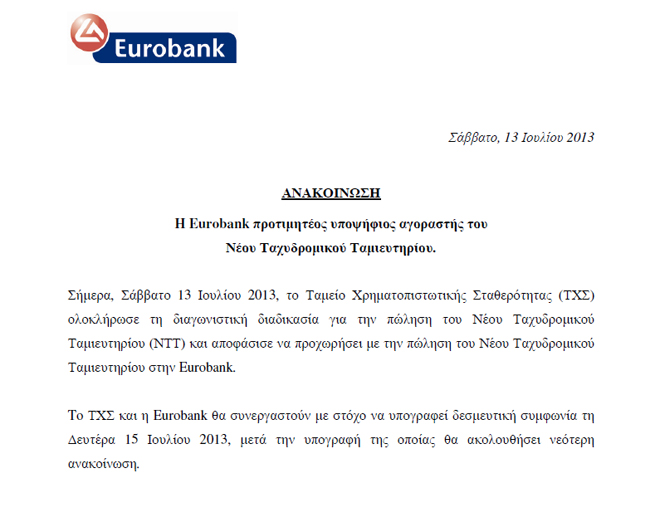 Σήμερα, Σάββατο 13 Ιουλίου 2013, το Ταμείο Χρηματοπιστωτικής Σταθερότητας (ΤΧΣ) ολοκλήρωσε τη διαγωνιστική διαδικασία για την πώληση του Νέου Ταχυδρομικού Ταμιευτηρίου και αποφάσισε να προχωρήσει με την πώληση του Νέου Ταχυδρομικού Ταμιευτηρίου στην Eurobank.