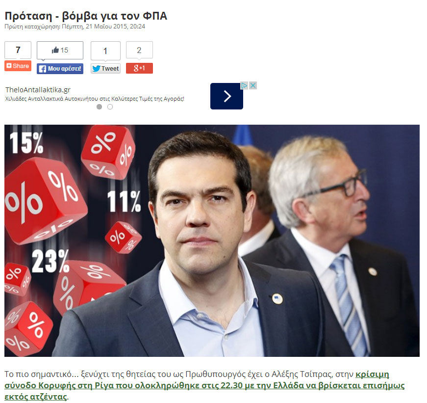 Σε αναμμένα κάρβουνα κάθεται το Μέγαρο Μαξίμου καθώς εντείνονται οι διαβουλεύσεις για τον ΦΠΑ. Τα αποτελέσματα των διαπραγματεύσεων σε επίπεδο Brussels Group δεν εναρμονίζονται με τις προσδοκίες της ελληνικής κυβέρνησης για τη διατήρηση ενός χαμηλού συντελεστή στα είδη πρώτης ανάγκης (7%), προκαλώντας αναβρασμό στο εσωτερικό του ΣΥΡΙΖΑ. Οι θεσμοί ζητούν τον καθορισμό δύο συντελεστών φορολόγησης (12 και 23%), πρόταση που φέρνει σειρά αλλαγών στις τιμές προϊόντων και υπηρεσιών.