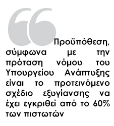 Προϋπόθεση, σύμφωνα με την πρόταση νόμου του Υπουργείου Ανάπτυξης είναι το προτεινόμενο σχέδιο εξυγίανσης να έχει εγκριθεί από το 60% των πιστωτών, στο οποίο περιλαμβάνεται το 40% των τυχόν εμπράγματων εξασφαλίσεων. Ουσιαστικά, πρόκειται για ρύθμιση που δεσμεύει το σύνολο των πιστωτών της επιχείρησης, οι απαιτήσεις των οποίων ρυθμίζονται, ακόμη και αν δεν είναι συμβαλλόμενοι στη συμφωνία. Όπως αναφέρθηκε και νωρίτερα, η πρόταση δίνει έμφαση στον ρόλο που καλείται να διαδραματίσει η τράπεζα στη διαχείριση και αντιμετώπιση του υφιστάμενου χρέους. Πρακτικά, θα έχει τη δυνατότητα να αξιοποιήσει κάθε «πρόσφορο μέσο» κατά τη διαδικασία κατάρτισης του πλάνου βιωσιμότητας, σε συνεργασία με τις διοικήσεις των υπερχρεωμένων επιχειρήσεων.