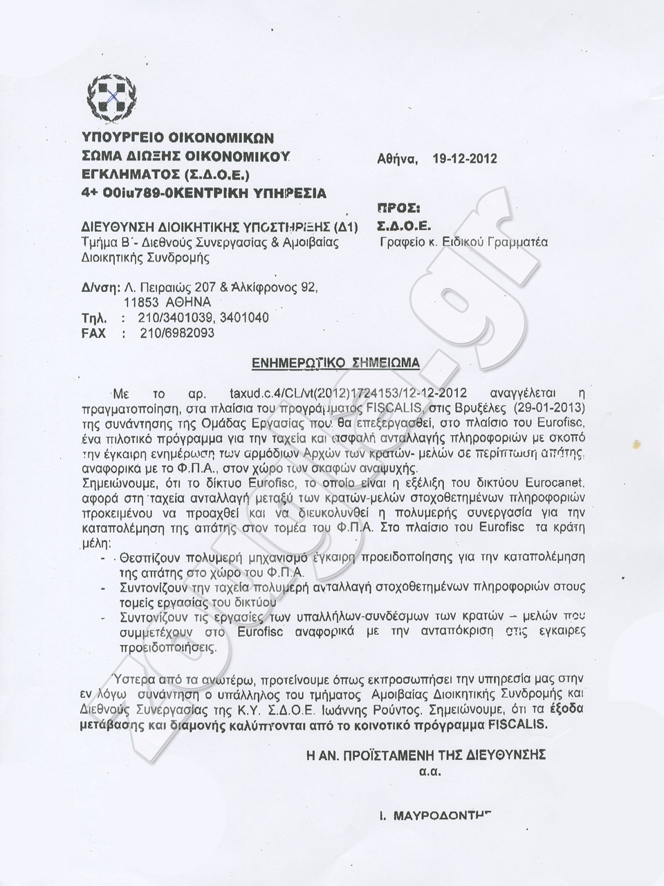 «Το δίκτυο θα αφορά στη ταχεία ανταλλαγή μεταξύ των κρατών-μελών στοιχειοθετημένων πληροφοριών προκειμένου να προαχθεί και να διευκολυνθεί η πολυμερής συνεργασία για την καταπολέμηση της απάτης στον τομέα του Φ.Π.Α.» αναφέρεται στο έγγραφο που κοινοποιήθηκε στο ΣΔΟΕ.