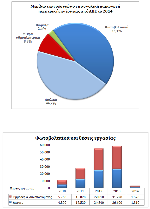 Σύμφωνα με τον Σύνδεσμο Εταιριών Φωτοβολταϊκών (HELAPCO), το 2014 ήταν μια πολύ κακή χρονιά για την αγορά φωτοβολταϊκών στην Ελλάδα. Εγκαταστάθηκαν ελάχιστα συστήματα (το μέγεθος της αγοράς ήταν μόλις 1,5% της αντίστοιχης του 2013), ενώ χάθηκαν χιλιάδες θέσεις εργασίας στον κλάδο. Αιτία υπήρξε η καταστροφική πολιτική που ακολουθήθηκε, σε μια προσπάθεια να διορθωθούν παλαιότερες θεσμικές αστοχίες.