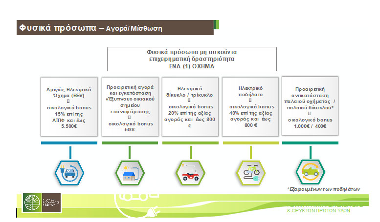 -Επιπλέον μπόνους απόσυρσης, ύψους 1.000 ευρώ για ΙΧ και 400 ευρώ για μοτοσικλέτες αν ο αγοραστής του ηλεκτρικού οχήματος προχωρήσει σε απόσυρση του παλιού.