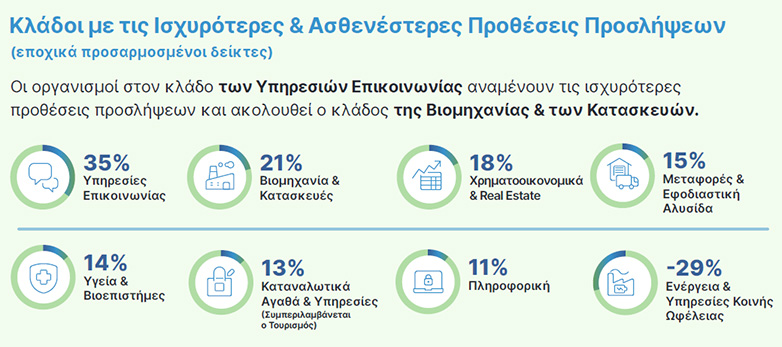Ο πιο ανταγωνιστικός κλάδος στην Ελλάδα είναι οι Υπηρεσίες Επικοινωνίας, με δείκτη 35%. Παρά το γεγονός ότι οι προσδοκίες στον κλάδο αποδυναμώθηκαν κατά 15 μονάδες από το προηγούμενο τρίμηνο, αυξήθηκαν κατά 2 μονάδες από το 1ο τρίμηνο του 2024. Η Ελλάδα κατέχει την 3η θέση παγκοσμίως για τις προθέσεις προσλήψεων του κλάδου Υπηρεσιών Επικοινωνίας, ξεπερνώντας τον παγκόσμιο μέσο όρο κατά 21 μονάδες.