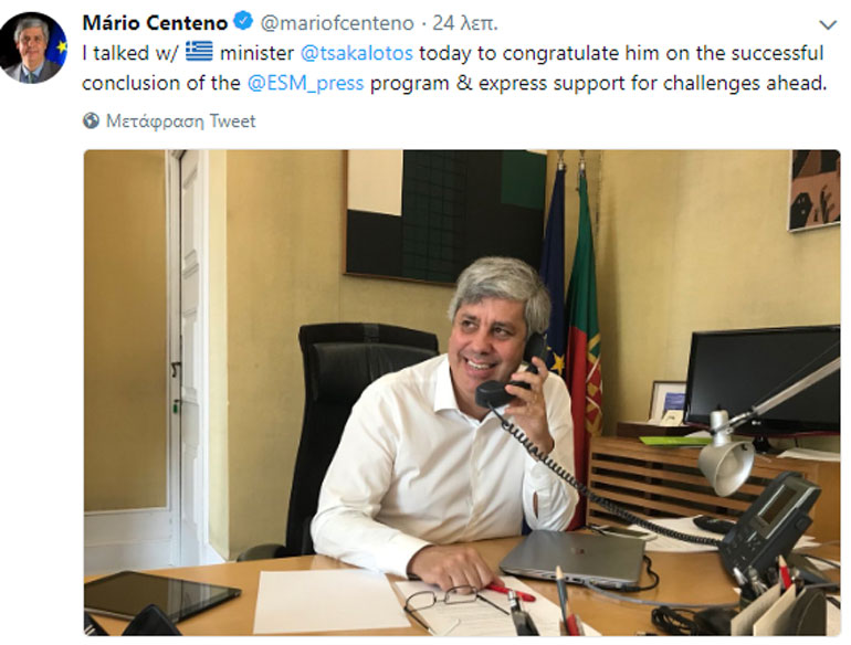 «Μίλησα με τον υπουργό Ε. Τσακαλώτο για να το συγχαρώ για την επιτυχή ολοκλήρωση του προγράμματος και να εκφράσω στήριξη για τις προκλήσεις που είναι μπροστά», έγραψε ο Μ. Σεντένο.
