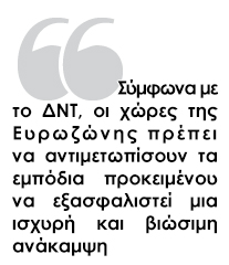 Σύμφωνα με το Ταμείο, αν και η οικονομία της Ευρωζώνης ανακάμπτει, οι χώρες πρέπει να αντιμετωπίσουν τα βαθιά ριζωμένα εμπόδια, προκειμένου να εξασφαλιστεί μια ισχυρή και βιώσιμη ανάκαμψη.