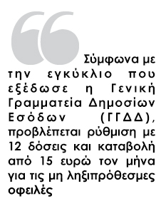 Στην πάγια ρύθμιση των 12 δόσεων, με τους ίδιους όρους που ισχύουν για τις ληξιπρόθεσμες οφειλές, μπορούν να υπαχθούν μεταξύ άλλων: