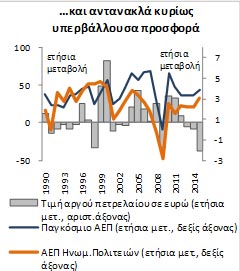 Συγκεκριμένα, η ποσοστιαία μείωση των διεθνών τιμών του αργού πετρελαίου το τελευταίο εννεάμηνο συγκαταλέγεται στις 4 μεγαλύτερες των τελευταίων 40 ετών. Παράλληλα, διαπιστώνεται ότι αντανακλά κυρίως μια διατηρήσιμη αύξηση της προσφοράς βασισμένη σε καινοτομίες, σημαντικές μακροχρόνιες επενδύσεις και νέα δυναμικότητα εξορύξεων (ειδικά στις ΗΠΑ), καθώς και ευνοϊκούς γεωπολιτικούς παράγοντες (Ιράν). Η σημαντική αύξηση της παγκόσμιας προσφοράς συνδυάζεται με εξαιρετικά αργή ανάκαμψη της διεθνούς ζήτησης. Αντιθέτως, οι περισσότερες από τις σημαντικές φάσεις διόρθωσης των τιμών στο παρελθόν — εκτός αυτής του 1986 — αντανακλούσαν κυρίως περιόδους μείωσης της ζήτησης που συνέπεσαν με διεθνείς υφέσεις ή σημαντική, ωστόσο προσωρινή, επιβράδυνση της οικονομικής δραστηριότητας παγκοσμίως και ως εκ τούτου, παρείχαν περιορισμένη ώθηση στις οικονομίες που εξαρτώνται από εισαγωγές πετρελαίου.