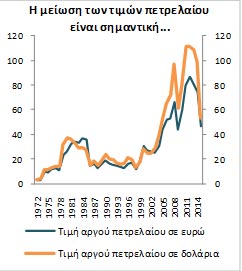 Ιστορικά, έχει αποδειχθεί ότι η τελική επίδραση των πετρελαϊκών τιμών στην οικονομία είναι συνάρτηση τριών βασικών παραγόντων: του ποσοστού μείωσης των τιμών, της χρονικής διάρκειας κατά την οποία παραμένουν σε χαμηλότερα επίπεδα, και της καθαρής εξάρτησης κάθε οικονομίας από τις εισαγωγές πετρελαίου. Ως εκ τούτου, με δεδομένο ότι η ελληνική οικονομία παρουσιάζει σημαντικά υψηλότερο ποσοστό εξάρτησης σε εισαγωγές πετρελαίου συγκριτικά με το μέσο όρο της ευρωζώνης, αναμένεται να είναι εκ των πλέον ωφελημένων στην ευρωζώνη. Παράλληλα, τόσο η παρατηρούμενη ένταση της διόρθωσης, όσο και η αναμενόμενη παραμονή των τιμών σε χαμηλά επίπεδα για αρκετό χρονικό διάστημα, συντείνουν στη μεγέθυνση της θετικής επίδρασης στην οικονομία.