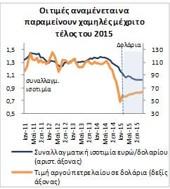 Αναμφισβήτητα η εξασθένιση του ευρώ σε σχέση με το δολάριο από τα τέλη του 2014 (-19% ετησίως το 4μηνο του 2015, «ακυρώνει» ένα τμήμα της μείωσης. Ωστόσο και σε όρους ευρώ, η αποκλιμάκωση των τιμών του αργού εκτιμάται ότι θα είναι επαρκώς ισχυρή (-25% κατά μ.ο. σε ετήσια βάση το 2015) ώστε να ασκήσει σημαντική θετική επίδραση στην οικονομική δραστηριότητα.