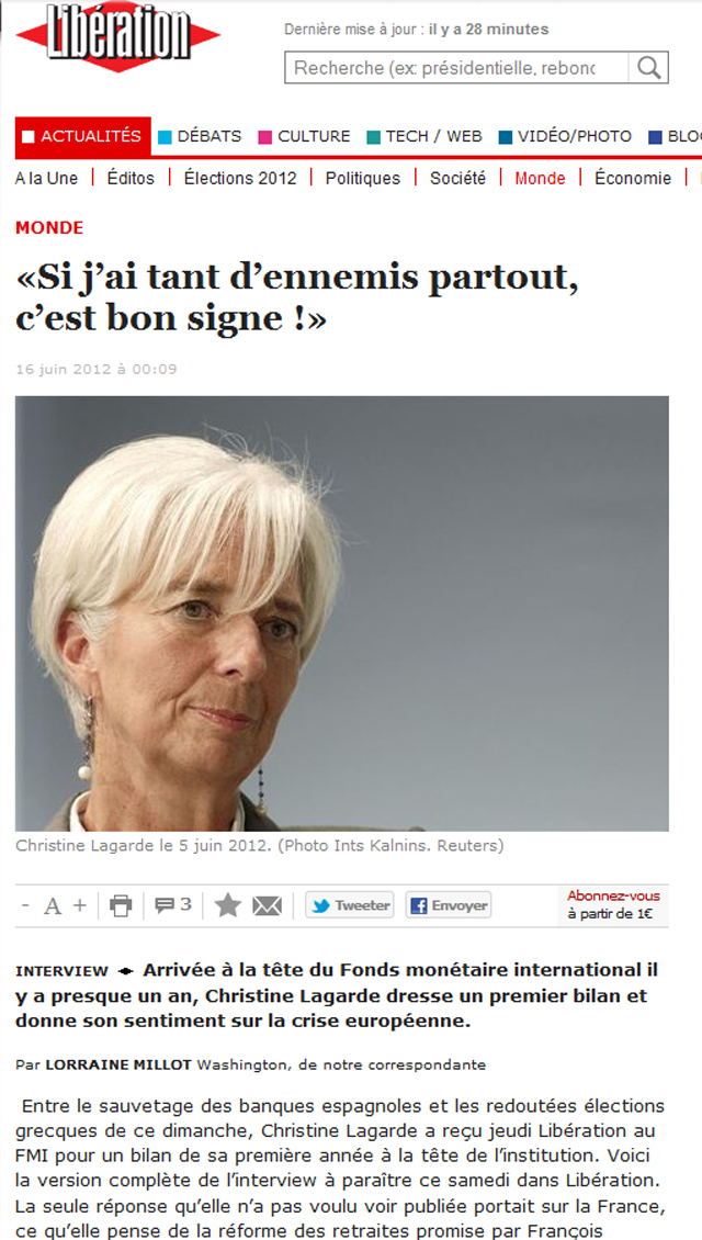 Με τίτλο «Εάν έχω τόσους εχθρούς παντού, είναι καλό σημάδι», η εφημερίδα «Libération» δημοσιεύει συνέντευξη της Κριστίν Λαγκάρντ, στην οποία η επικεφαλής του ΔΝΤ τονίζει μεταξύ άλλων την ανάγκη επικαιροποίησης του προγράμματος της Ελλάδας.