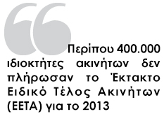 Αντιμέτωποι με… «μπιλιετάκι» της εφορίας θα βρεθούν σύντομα περίπου 400.000 ιδιοκτήτες ακινήτων, οι οποίοι δεν κατέβαλαν το χρηματικό ποσό που αντιστοιχεί στο Έκτακτο Ειδικό Τέλος Ακινήτων (ΕΕΤΑ) για το 2013.