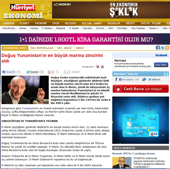 Ειδικότερα, η εταιρεία-κολοσσός συμφερόντων του Τούρκου μεγιστάνα με την επωνυμία Dogus ή D-Marin αγόρασε σήμερα το 51% της εταιρείας MedMarinas του ομίλου Κυριακούλη (σ.σ.: στην εκμετάλλευση της MedMarinas είναι και η μαρίνα Καλαμάτας). Σημειώνεται ότι η D-Marin, σύμφωνα με την ίδια πηγή, που έχει πλούσια δραστηριότητα και στην Κροατία, είναι θυγατρική της ΑCI, της μεγαλύτερης εταιρείας που δραστηριοποιείται στον χώρο παγκοσμίως. Με τις ελληνικές μαρίνες, όσες είναι κάτω από την εκμετάλλευση της Dogus ανέρχονται σε 21.