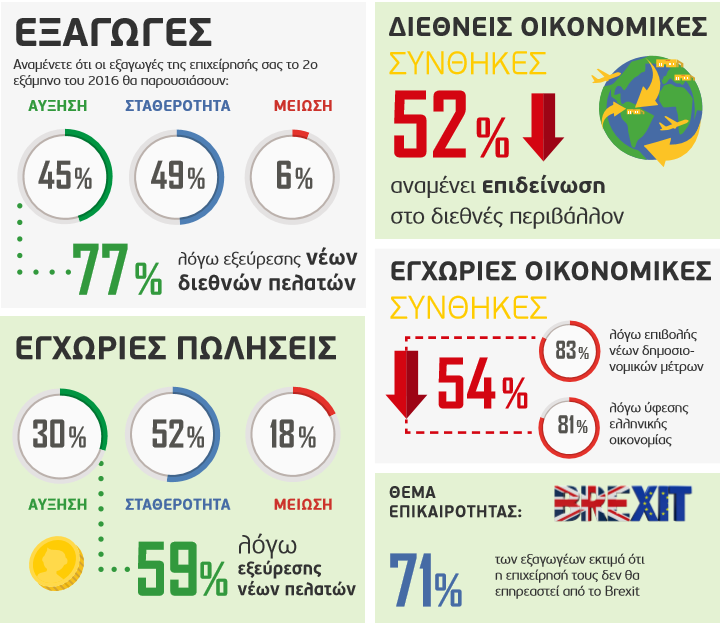 Θέμα επικαιρότητας: Brexit. Στην επίκαιρη ερώτηση σχετικά με τις εκτιμήσεις των Ελλήνων εξαγωγέων για το πώς θα επηρεαστεί η επιχείρηση τους από την έξοδο του Ηνωμένου Βασιλείου από την Ευρωπαϊκή Ένωση το β’ εξάμηνο 2016, το 71% απάντησε πως δεν θα επηρεαστεί. Ωστόσο, 1 στις 4 εξαγωγικές επιχειρήσεις απάντησε ότι θα επηρεαστεί αρνητικά. Οι κυρίαρχοι προβληματισμοί που εγείρονται λόγω του Brexit αφορούν στην αναμενόμενη επιβολή τελωνειακών ελέγχων και δασμών στα ευρωπαϊκά προϊόντα, στην εκτιμώμενη επιδείνωση της ύφεσης στην ελληνική οικονομία, ως συνέπεια του Brexit, στον περιορισμό των ευρωπαϊκών χρηματοδοτικών πόρων και στην μείωση της αγοραστικής δύναμης των Βρετανών καταναλωτών.