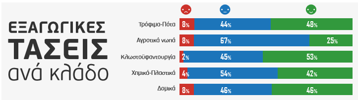 Εξαγωγές: Θετικές προβλέψεις για την πορεία των διεθνών τους πωλήσεων τους προσεχείς μήνες εκφράζουν οι εξαγωγικές επιχειρήσεις, καθώς ποσοστό 49% εξ αυτών θεωρεί ότι θα παραμείνουν στα ίδια επίπεδα με το α’ εξάμηνο 2016, ενώ ποσοστό 45% αναμένει ότι θα αυξηθούν. Μάλιστα, το 77% των θετικών απαντήσεων αναφέρει ότι η εκτιμώμενη αύξηση αποδίδεται στη διεύρυνση του πελατολογίου τους στο εξωτερικό, προσπάθεια η οποία οφείλεται κυρίως στη συστηματική προσπάθεια και στη στόχευση των επιχειρήσεων σε συγκεκριμένες διεθνείς αγορές. Κλαδικά, οι καλύτερες προσδοκίες για αύξηση εξαγωγών προέρχονται από τον κλάδο των χημικών-πλαστικών-φαρμακευτικών.