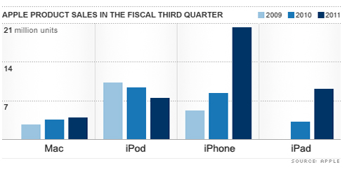 Η εταιρεία πούλησε στο τρίτο τρίμηνο του 2011 περισσότερα από 20 εκατ. κινητά τηλέφωνα iPhone και 9,25 εκατ. iPad.