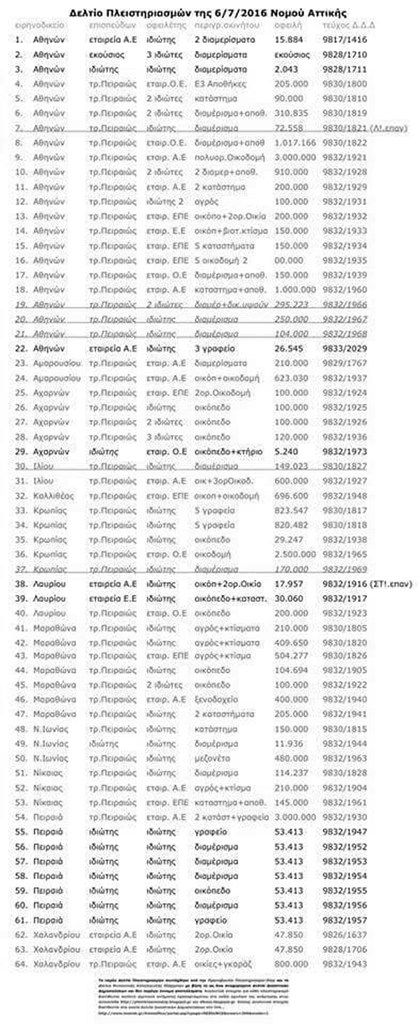 Συγκεκριμένα πρόκειται για: 22 πλειστηριασμούς στο Ειρηνοδικείο Αθηνών, 2 στο Ειρηνοδικείο Αμαρουσίου, 4 στο Ειρηνοδικείο Αχαρνών (Μενίδι), 2 στo Ειρηνοδικείο Ιλίου, 1 στο Ειρηνοδικείο Καλλιθέας, 5 στο Ειρηνοδικείο Κρωπίας, 3 στο Ειρηνοδικείο Λαυρίου, 7 στο Ειρηνοδικείο Μαραθώνα, 1 στο Ειρηνοδικείο Μεγάρων, 3 στο Ειρηνοδικείο Ν.Ιωνίας, 3 στο Ειρηνοδικείο Νίκαιας, 7 στο Ειρηνοδικείο Πειραιά και 3 στο Ειρηνοδικείο Χαλανδρίου.