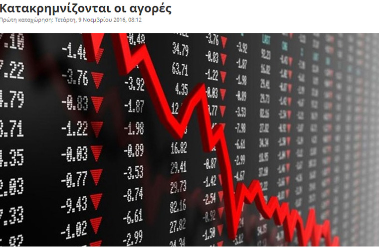 Σημαντική πτώση καταγράφουν οι χρηματαγορές σε όλο τον κόσμο, μετά τη νίκη του Ντόναλντ Τραμπ στις αμερικανικές εκλογές. Σχεδόν κατά 6% έφτασε να υποχωρεί ο δείκτης Nikkei 225 στο χρηματιστήριο του Τόκιο, ενώ και ο Hang seng στο Χονγκ Κονγκ κατέγραψε πτώση 4%. Στο κλείσιμο της συνεδρίασης ο Nikkei υποχώρησε κατά 5,36% πέφτοντας στις 16.251,54 μονάδες με πτώση 919,84 μονάδων.