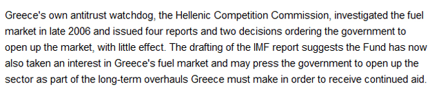 Στο δημοσίευμα αναφέρεται επίσης και η έρευνα που διενήργησε η Ελληνική Επιτροπή Ανταγωνισμού το 2006 για την αγορά καυσίμων. Αν και η αρμόδια Επιτροπή εξέδωσε τέσσερις εκθέσεις και κοινοποίησε δύο αποφάσεις, με τις οποίες διέταξε την κυβέρνηση να ανοίξει την αγορά, δεν υπήρξε κάποιο αποτέλεσμα.