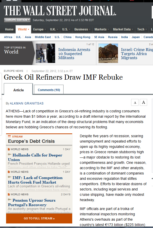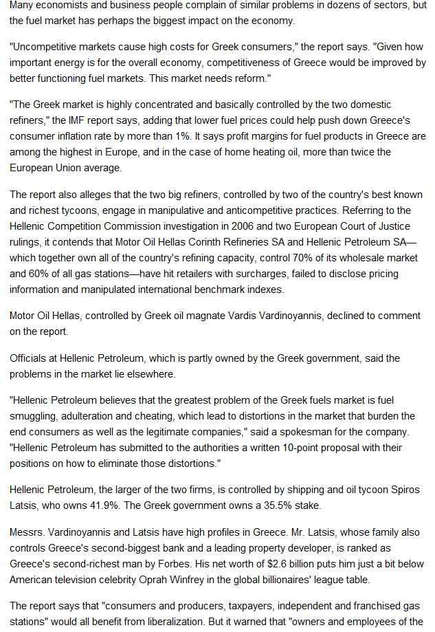 Έκθεση-κόλαφος του γραφείου του Διεθνούς Νομισματικού Ταμείου στην Αθήνα, την οποία δημοσίευσε η εφημερίδα «Wall Street Journal», αποκαλύπτει ότι η έλλειψη ανταγωνισμού στην ελληνική βιομηχανία διύλισης πετρελαίου κοστίζει στους καταναλωτές περισσότερα από 1 δις ευρώ ετησίως.