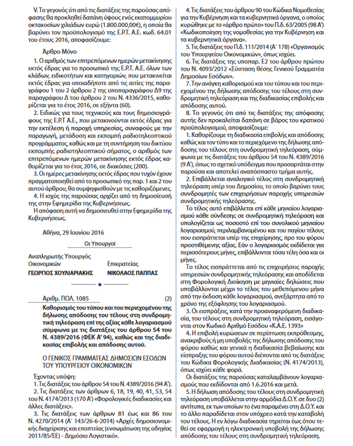 Καθορίζουμε τη διαδικασία επιβολής και απόδοσης καθώς και τον τύπο και το περιεχόμενο της δήλωσης απόδοσης του τέλους στη συνδρομητική τηλεόραση, σύμφωνα με τις διατάξεις του άρθρου 54 του Ν. 4389/2016 (9 Α’), όπως το σχετικό υπόδειγμα που προσαρτάται στην παρούσα και αποτελεί αναπόσπαστο τμήμα αυτής.