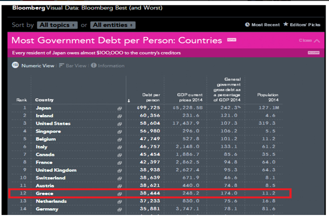 Η Ελλάδα βρίσκεται στην 12 θέση στη κατάταξη του κατά κεφαλήν χρέους με το χρέος επί του ΑΕΠ της χώρας να βρίσκεται στο 174%, ενώ κάθε Έλληνας χρωστά 38.444 δολάρια.
