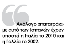 Ανάλογο «πατατράκ» με αυτό των Ισπανών έχουν υποστεί η Ιταλία το 2010 και η Γαλλία το 2002. Μάλιστα, η περίπτωση των «τρικολόρ» θυμίζει αρκετά αυτήν της ομάδας του Ντελ Μπόσκε, αφού τότε είχαν ταξιδεύσει στην Ιαπωνία και τη Νότια Κορέα ως πρωταθλητές Κόσμου (1998) και Ευρώπης (2000).