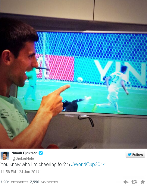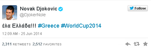 Ο διάσημος Σέρβος τενίστας, ο οποίος είχε εκφράσει προ ημερών την υποστήριξή του στη «γαλανόλευκη», παρακολούθησε τις προσπάθειες των διεθνών του Σάντος απέναντι στην Ακτή Ελεφαντοστού και μετά το 1-0 του Σάμαρη πόσταρε στο twitter: «Ξέρετε για ποιον πανηγυρίζω».