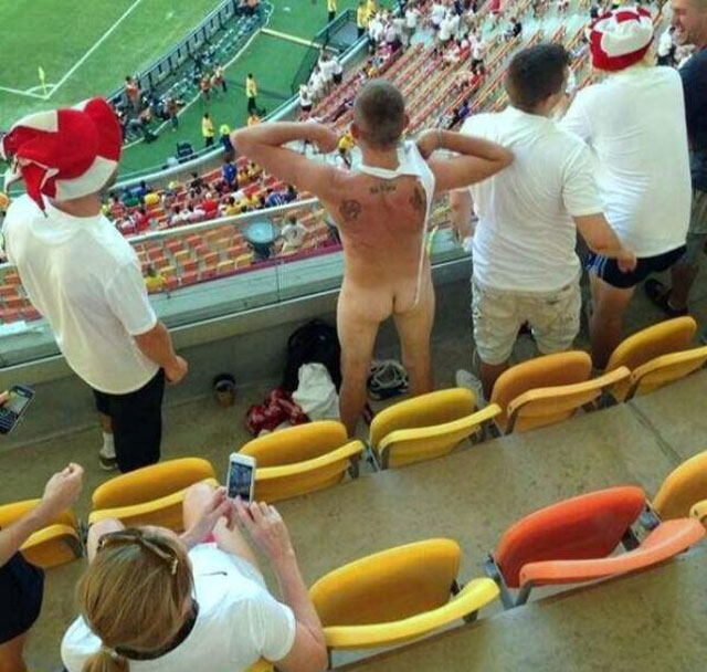 Η Ιταλία νίκησε την Αγγλία, και ένας οπαδός Άγγλος, πιθανότατα μεθυσμένος, όταν είδε την ομάδα του να χάνει «βγήκε» κυριολεκτικά απ’ τα ρούχα του στην εξέδρα.