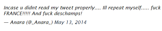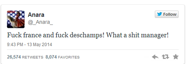 Ανάρτησε ένα απίστευτο tweet που έβρισε τόσο τη Γαλλία όσο και τον Ντιντιέ Ντεσάμπ μετά τον αποκλεισμό του αγαπημένου της. Μέσω του twitter, έβρισε όλο το έθνος της Γαλλίας, αλλά και προσωπικά τον ομοσπονδιακό τεχνικό. Στη συνέχεια, επανέλαβε τη φράση της, καθώς φοβήθηκε πως κάποιοι δεν θα το είχαν δει… Δείτε τα δύο της tweet:
