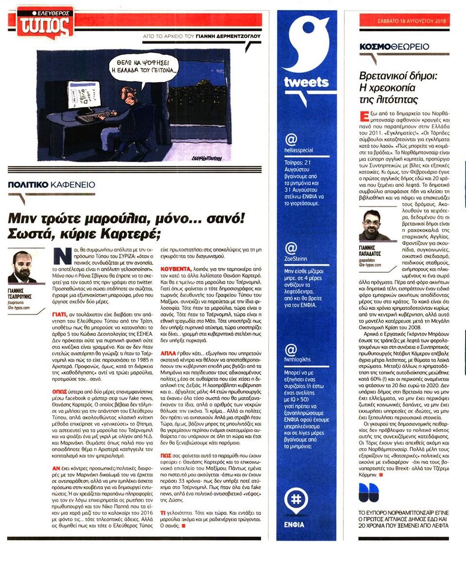 ΕΛΕΥΘΕΡΟΣ ΤΥΠΟΣ - 18 Αυγούστου 2018