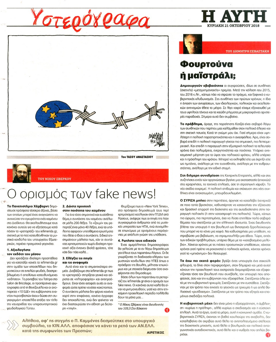 Η ΑΥΓΗ ΤΗΣ ΚΥΡΙΑΚΗΣ - 21 Οκτωβρίου 2018