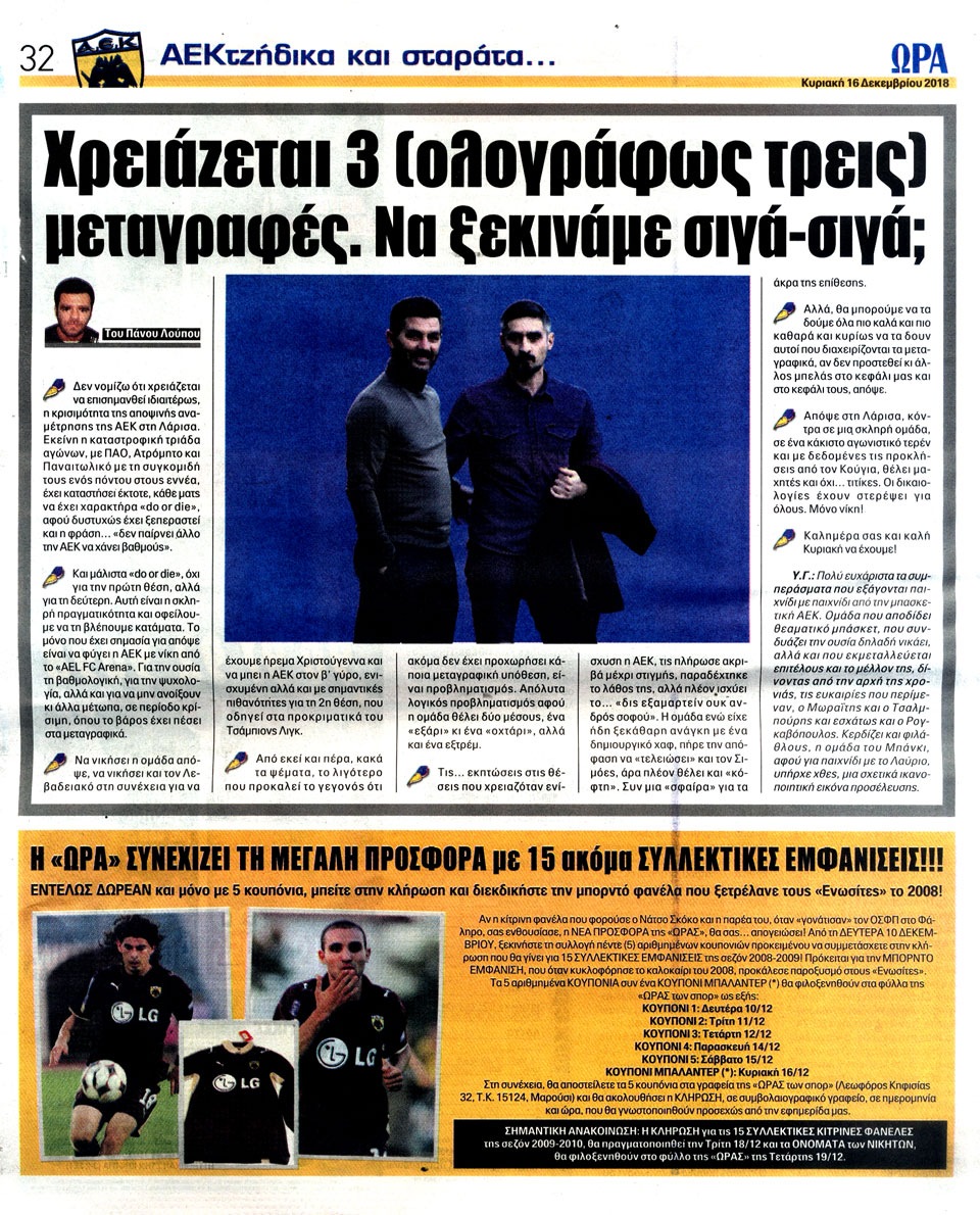 ΑΘΛΗΤΙΚΗ ΩΡΑ ΤΩΝ ΣΠΟΡ - 16 Δεκεμβρίου 2018